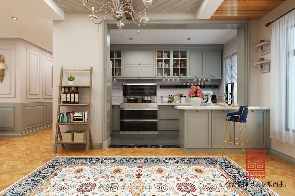 對于大戶型來說,廚房空間原本就非常寬敞的了,要解決的問題是避免廚房大而空,導致生活動線太長,做起飯來不方便,在中間布置上一個中島臺,整體廚房就會更加方便舒適。