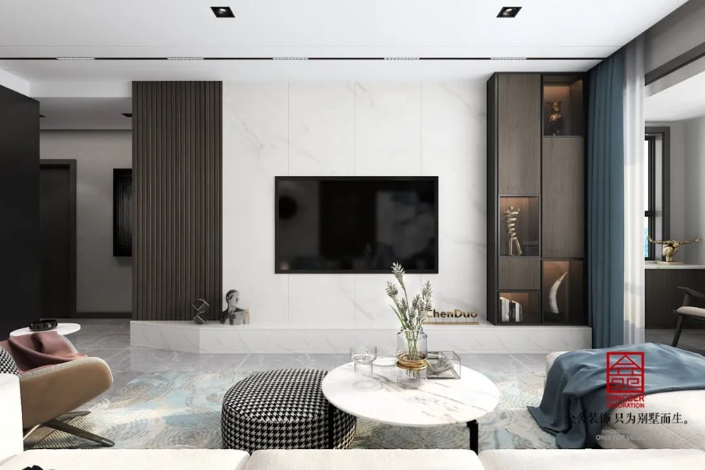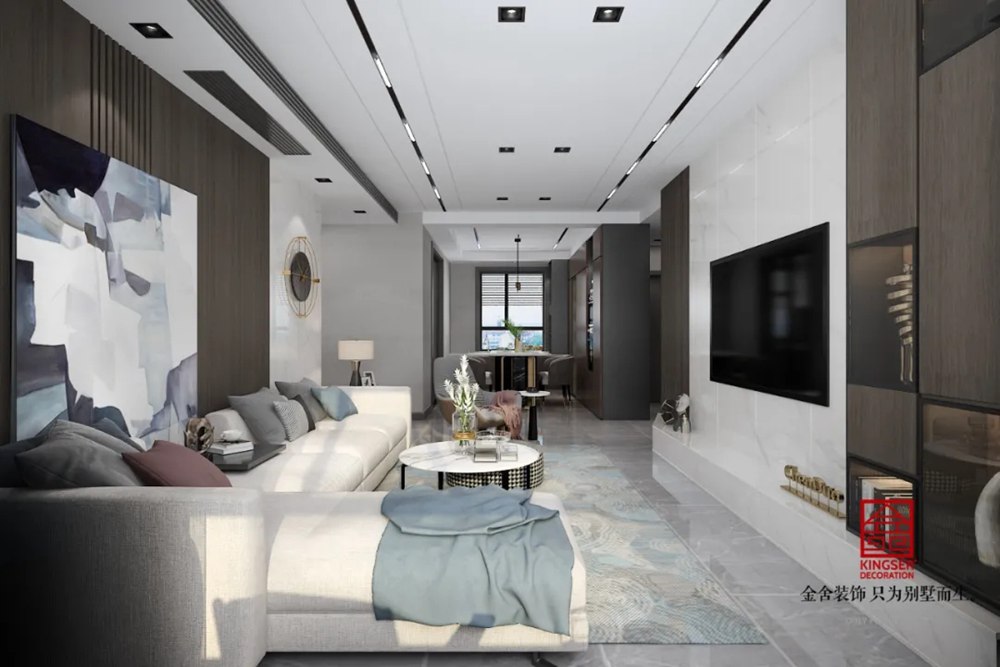 客廳裝飾簡約、工整、自然,開闊通透的空間感受、簡單而不浮夸的室內裝飾、精致完美的細節表達,都在隨時傳達著主人的格調與品位,兩種不同材質混合的造型墻即整體,又充滿現代感,空間利用率高,增加整個空間的縱深感。