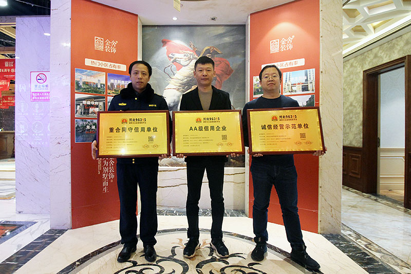 榮獲“重合同守信用單位”“誠信經營示范單位”“雙A級信用企業”稱號,這既是市場監管機構對金舍裝飾高標準的肯定,也是對金舍裝飾的鼓勵和鞭策
