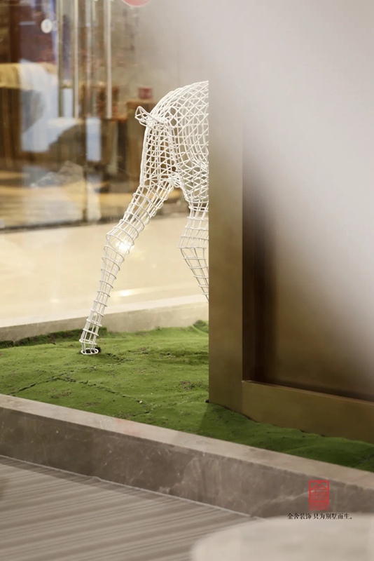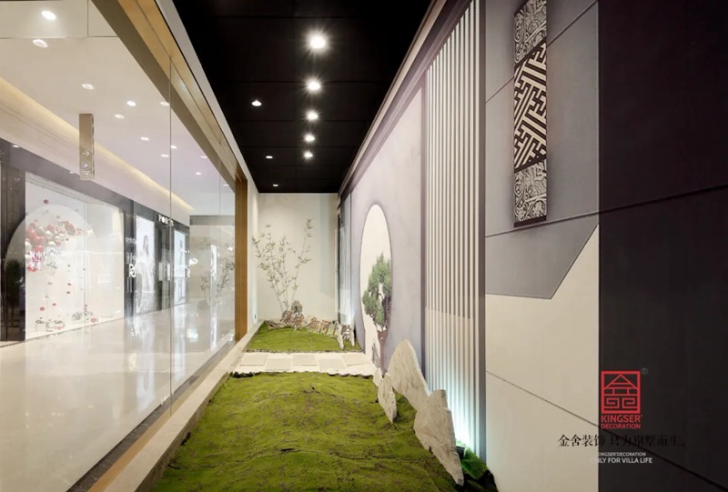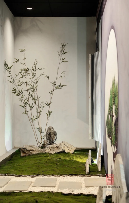 -御河上院在商場的樓盤展示區裝修實景,在設計中將自然與人文的意象融入室內設計,綠意盎然的自然景象以其深厚的文化底蘊滋潤著人們的心靈,對自然的認識和感悟,讓人豁然開朗,心曠神怡,也就成為中國傳統文化資產的傳承、轉譯與新生 。