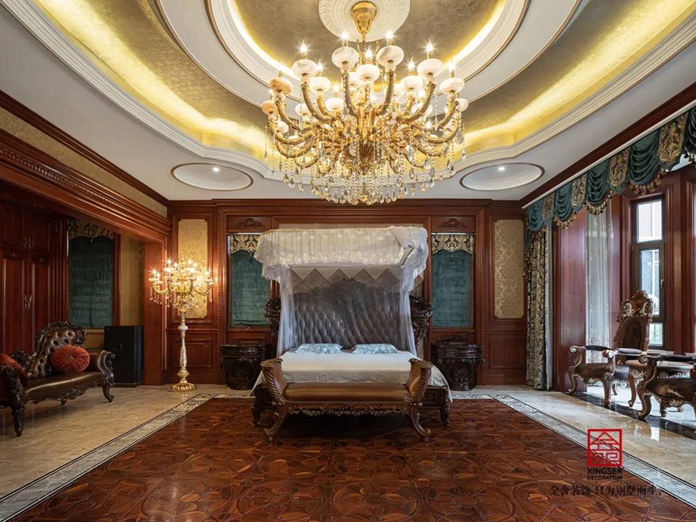 一樓東廳男女主人居住,色彩整體色調為秋香色、琥珀棕,從而體現了富麗堂皇,高柜清新的整體環境。