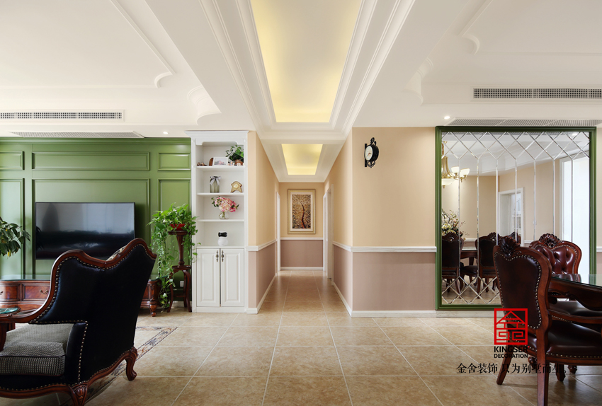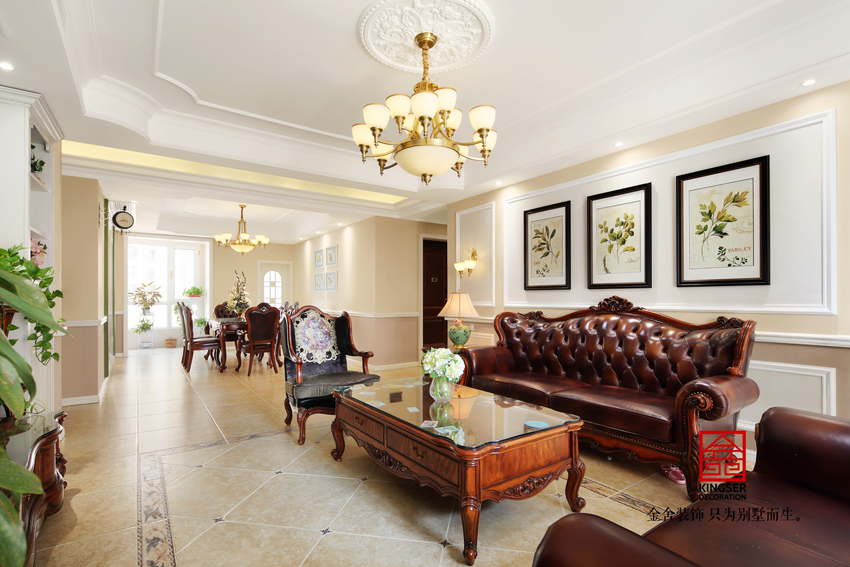石家莊別墅裝修設計的客廳的布置頗有一種美式風格的典型特征,厚重感十足的沙發搭配墻面淺色的畫作,嚴肅又帶有幾分輕松的感覺。客廳中綠色的盆栽給空間增加了幾分活力,墻面的造型搭配淡雅的燈光,靈巧純潔,恬靜活潑,柔和中流露出激情。