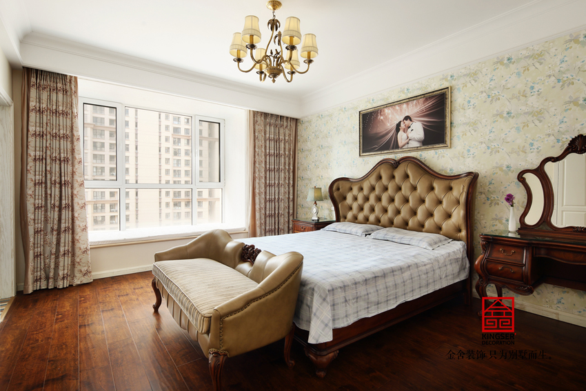 主臥布局簡潔大方,不失溫馨典雅的氛圍,燈光均采用暖色光源加床邊美式風格,給人溫馨舒適的魅力,支撐同色領帶床,給人清新舒適的感覺。