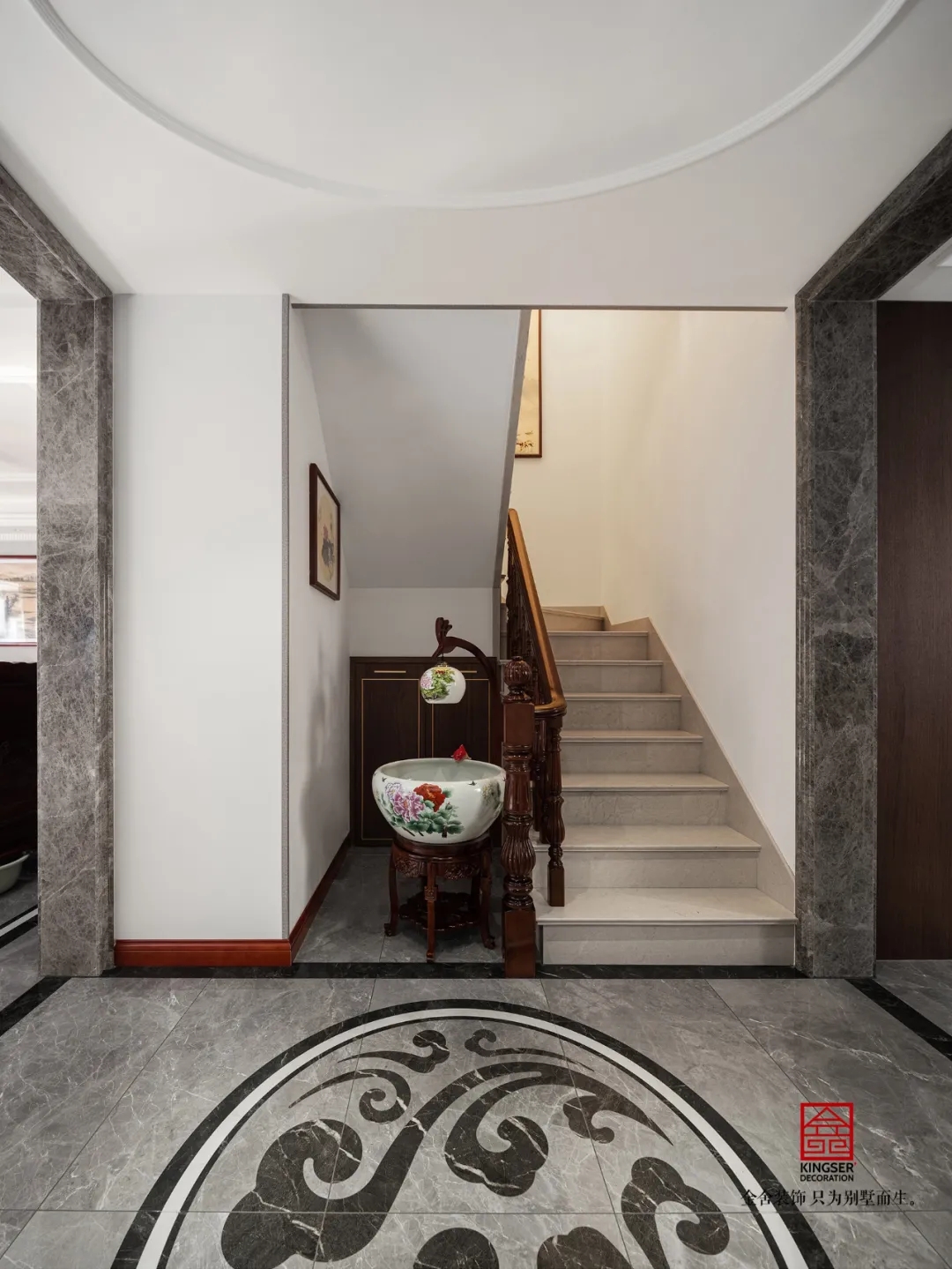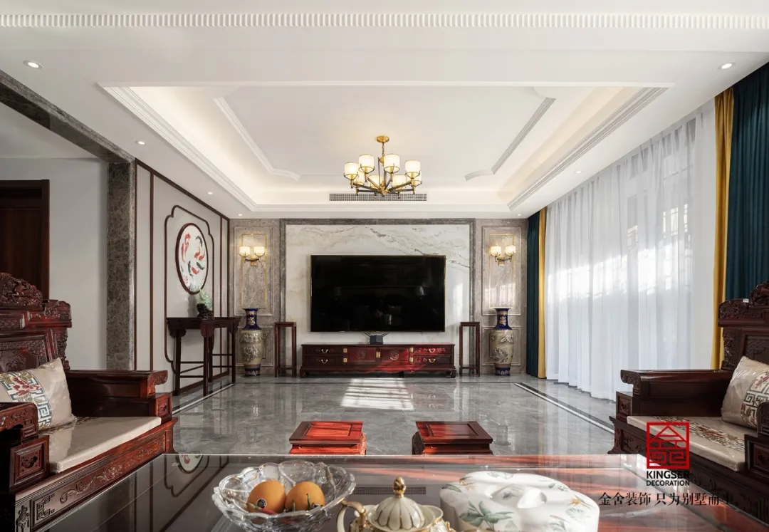 此案例為石家莊金舍裝飾-大者別墅300平米新中式風格裝修實景。客廳空間運用木質的材質組合搭配,帶來視線的清涼質感,同時中式的端莊典雅又慢慢在空間散發開來。古銅色的吊燈精致而特別,立體感十足,柔和了空間氛圍。中式的古木家具沉靜而典雅,細致的雕花設計凸顯主人的不凡品位。而地板的大理石紋理又很合適宜地給空間帶來了時尚的現代氣息,非常愜意。