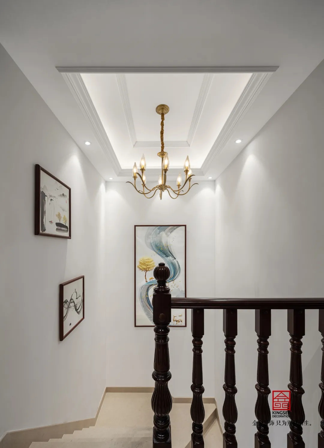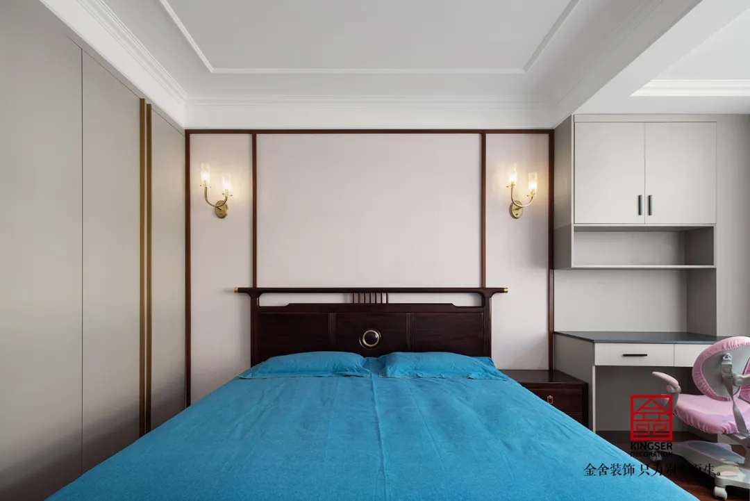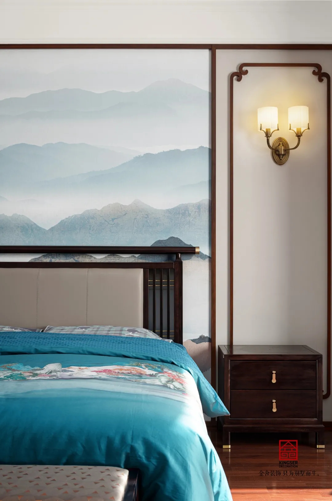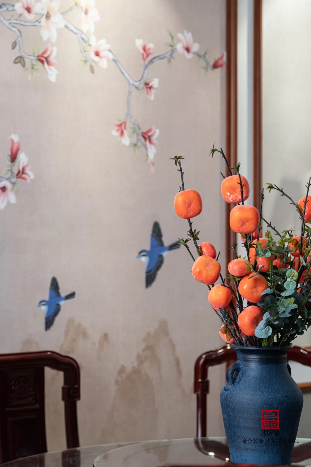 餐廳的圓形餐桌與方形吊頂相呼應,完美的嵌入了“方圓之間”的東方生活美學。既保留了原有頂面的高度又合理的劃分了空間,讓空間看起來更寬敞。餐廳背景墻的工筆花鳥更是提高了整個空間的靈動感,似在平淡的生活增加一份閑趣,讓家人在一飲一品之間感受生活的幸福。