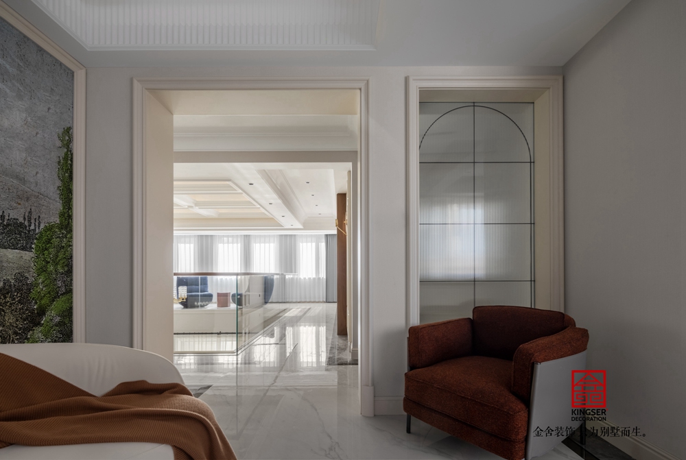 二層空間進行了很大范圍的改動,在二樓專門搭出了一個休閑觀景區,保證空間的完美利用的同時,又給人一處放松的空間。同時將一個臥室改成了書房,透明隔墻的處理,增加空間采光,也是為了孩子們有一個很好的閱讀上網的空間。