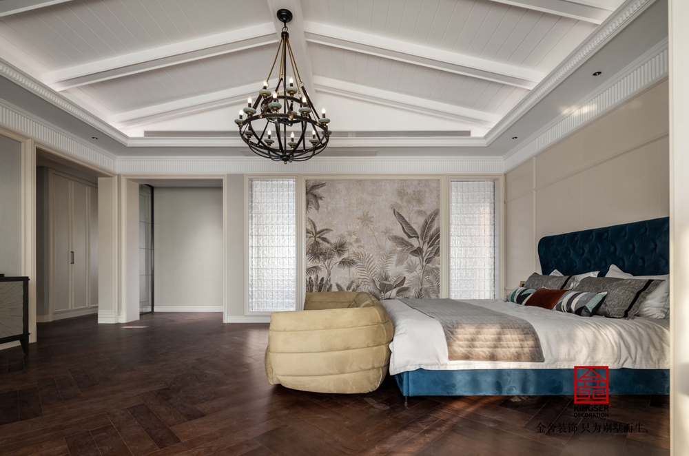 三層的空間就屬于完全的靜區了,除了一個三合一套間式的主臥之外還有一個書房。主臥完全采用深棕色木地板,吻戲而舒適,玻璃磚的設計保證了走廊的采光,將近四十平的臥室也給人一種氣派而美觀的感覺。