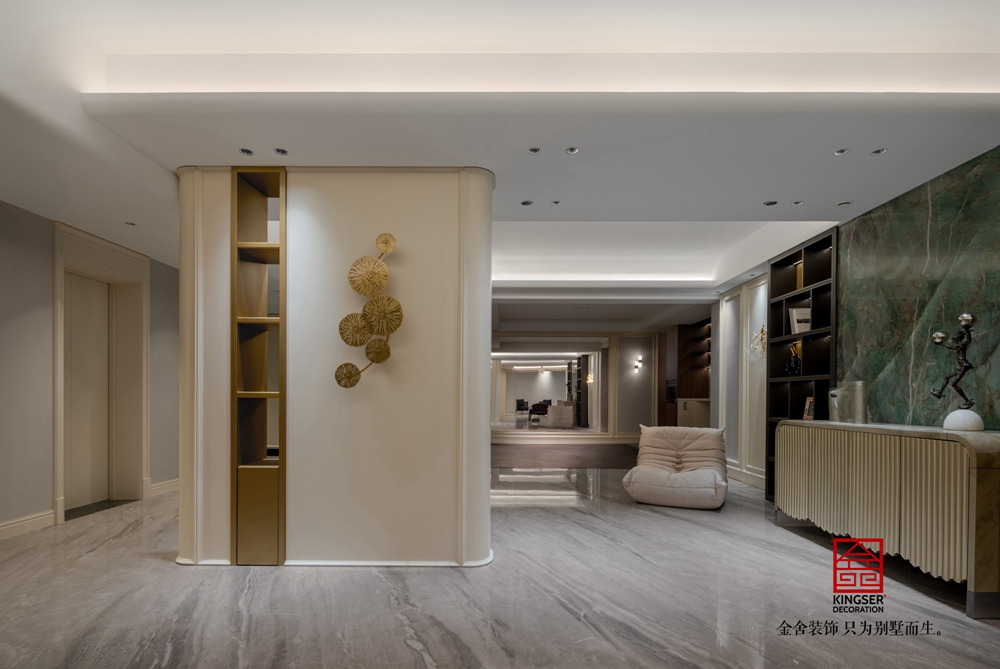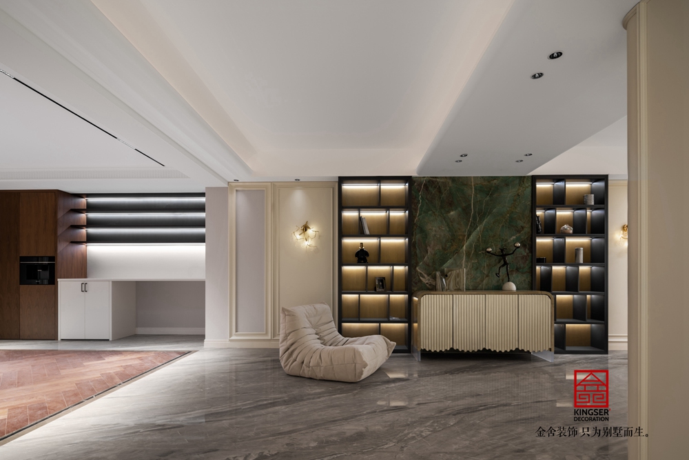 餐廳空間采用了透光奢石,這種材質以其高貴的氣質和獨特的紋理,為餐廚空間增添了一份奢華感。