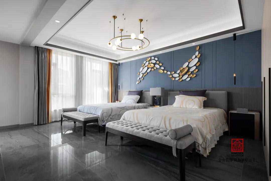 二樓通過功能分區(qū)實現(xiàn)臥室空間的最大化利用,主臥采用雙床錯位布局提升睡眠舒適度,床頭背景墻以水波紋理裝飾營造沉浸式睡眠氛圍。內(nèi)部獨立設(shè)置桑拿房與休閑陽臺,通過玻璃隔斷實現(xiàn)干濕分離,既滿足養(yǎng)生需求又延伸休閑功能。