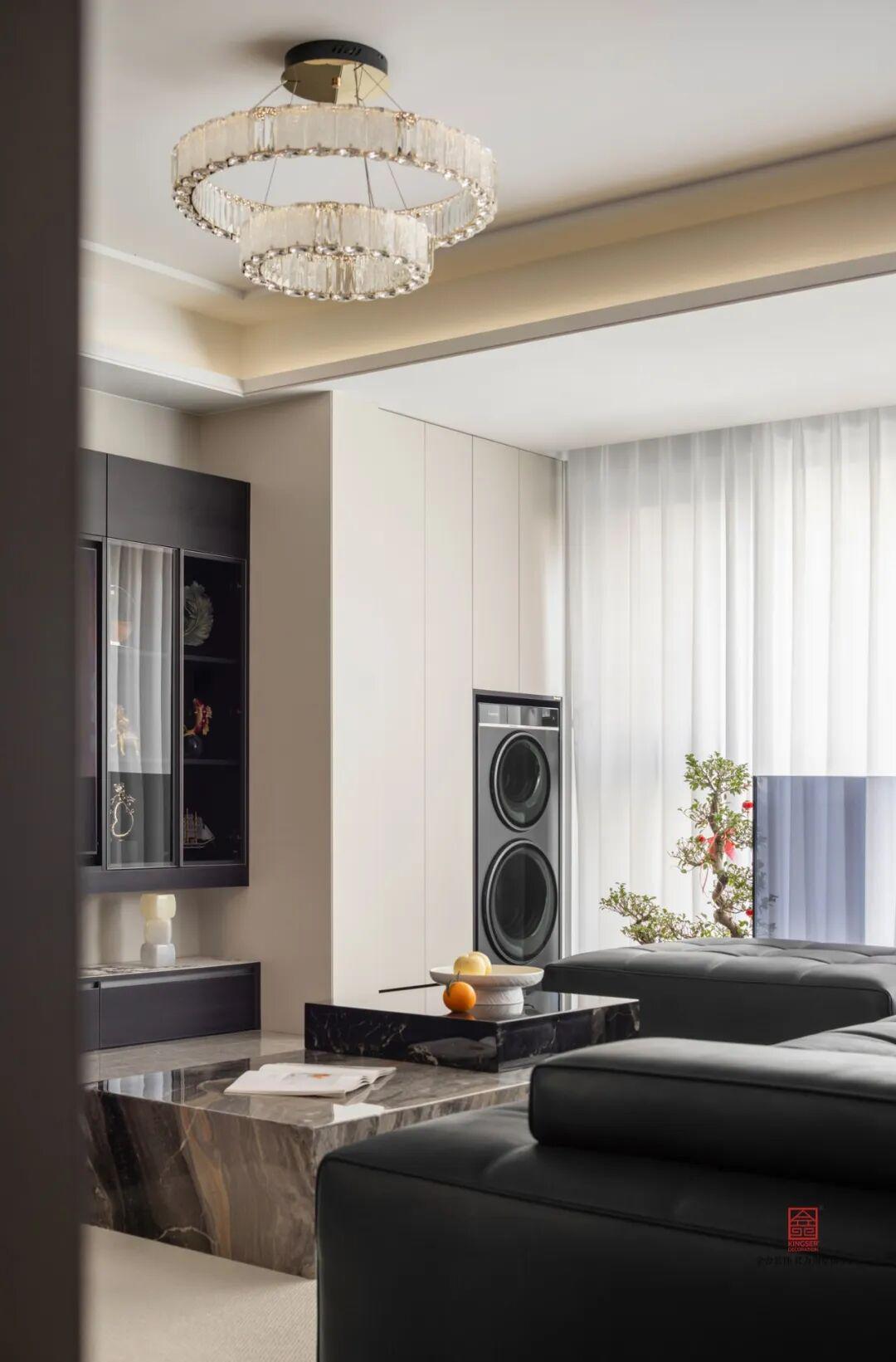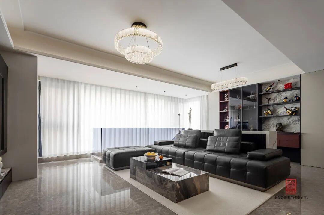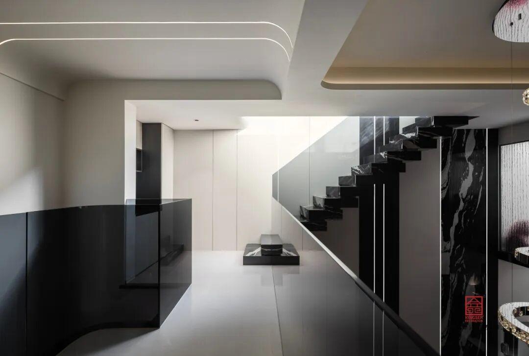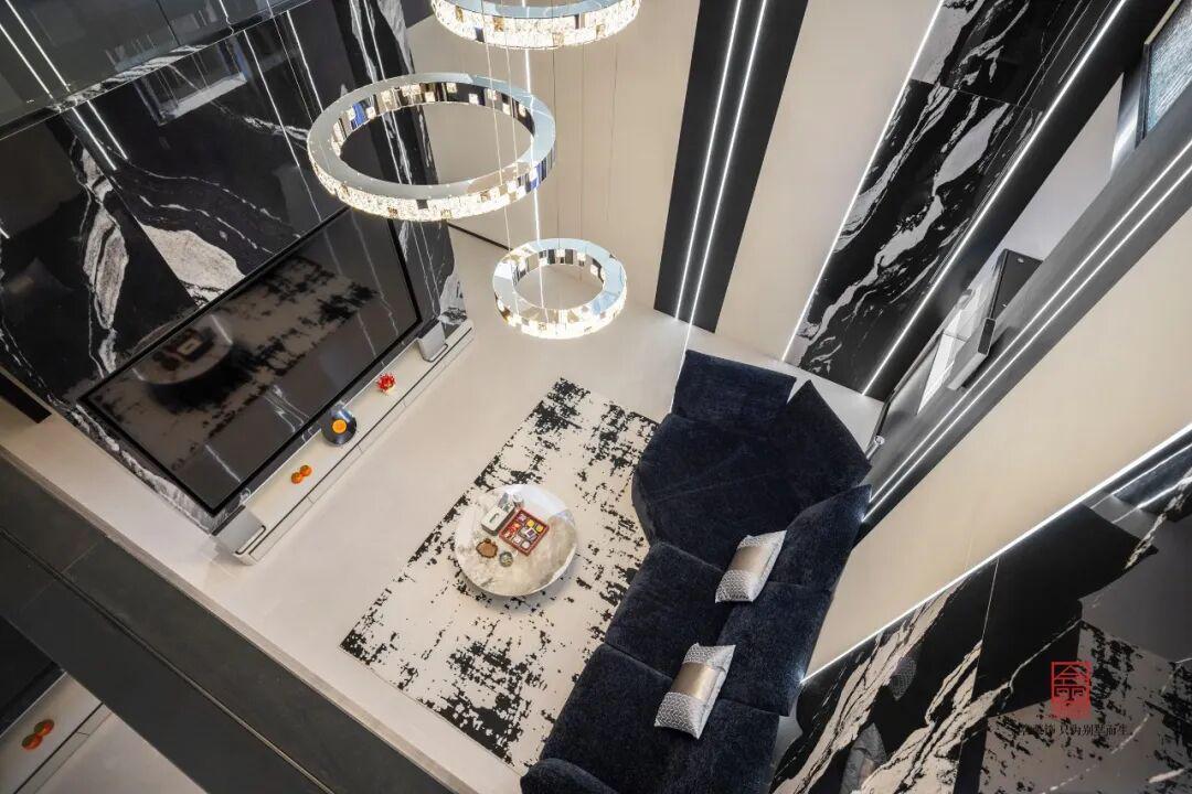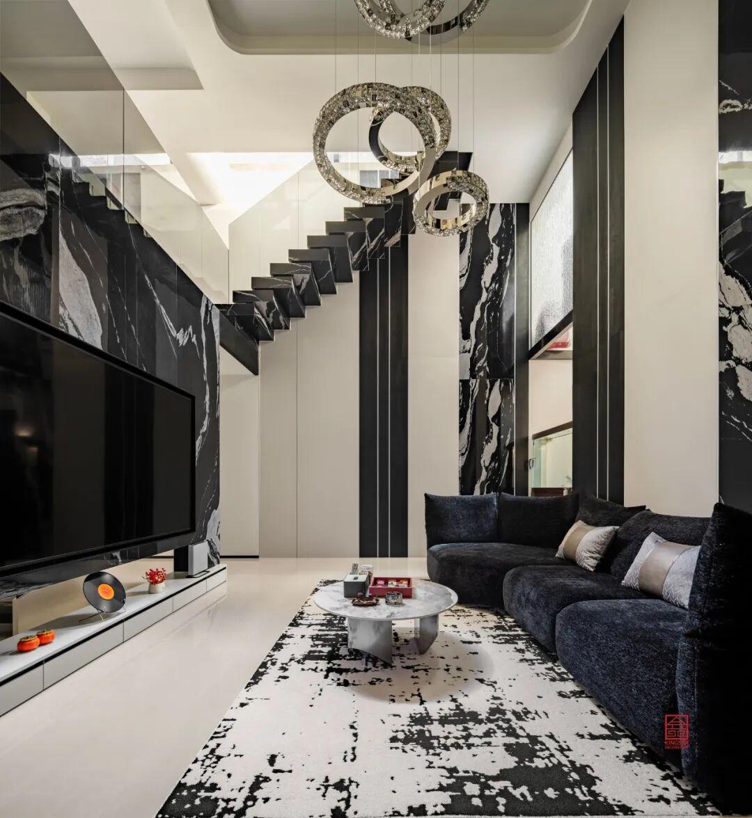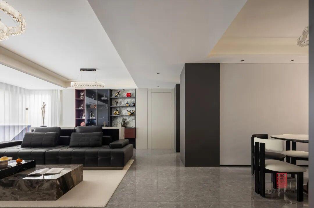負(fù)二客廳中,材質(zhì)的運用更加的出彩,黑白紋理的大理石嵌入條狀的燈槽,在夜晚用燈帶就能感受到非同凡響的光效,簡單的設(shè)計就讓整個空間明暗層次分明,兼具氛圍感與高級感,讓簡約空間更具張力與質(zhì)感。