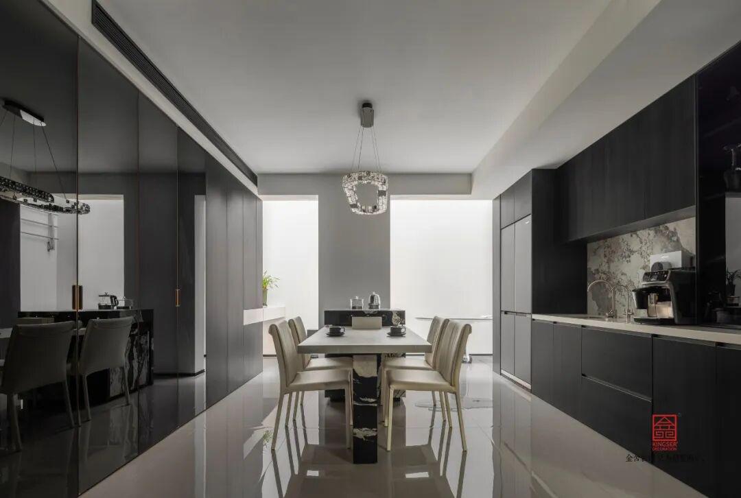 收納與實用在這個空間里被體現(xiàn)得淋漓盡致。餐廳面積雖不算開闊,卻在有限格局里將功能與美感做到極致。經(jīng)典黑白彼此呼應(yīng),利落線條勾勒出簡約大氣的視覺效果,與整體空間調(diào)性高度統(tǒng)一。造型簡約的現(xiàn)代燈飾質(zhì)感溫潤,光影錯落間提升了空間層次,讓小而精致的餐廳兼具實用性與高級感,簡約克制卻處處透著用心與精致。