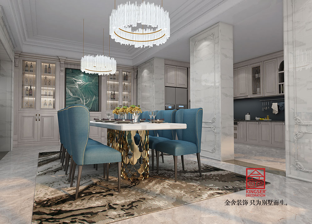 設計說明:此案例為石家莊金舍裝飾-西山御園700平米歐式風格裝修效果圖。本次設計在空間上徹底打破了原始的格局規劃,重新在表現形式上推陳出新;拋棄了原先以墻面裝飾為主的傳統設計手法,反而從結構本身出發,大膽采用“無框設計”和“重點設計”,利用不同材質的搭配營造出一種浪漫的、高貴的、典雅的家居空間。