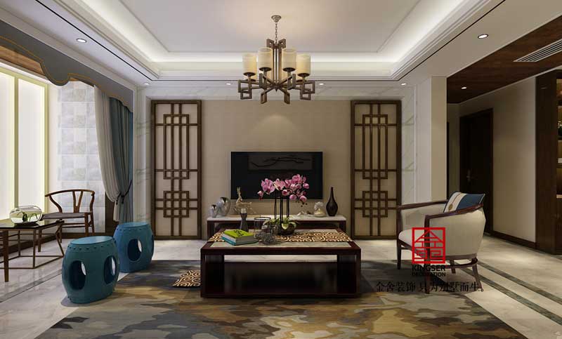 在室內(nèi)裝飾設(shè)計(jì)搭配上,以沉穩(wěn)的深色調(diào)為主搭配藍(lán)色紅色等亮色形成對(duì)比,表達(dá)對(duì)清雅含蓄、端莊豐華的東方式精神境界的追求。