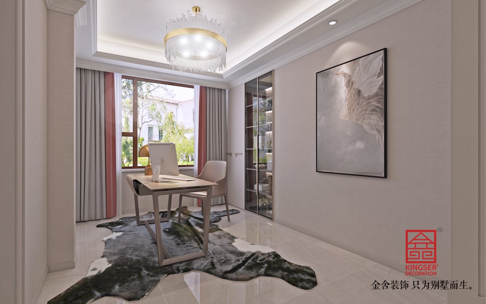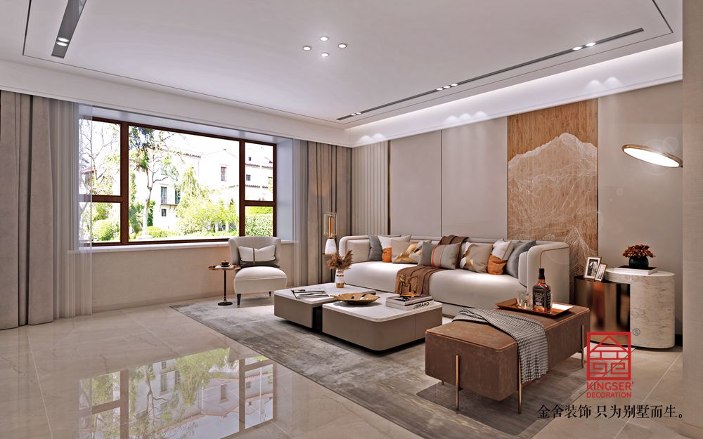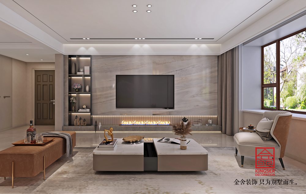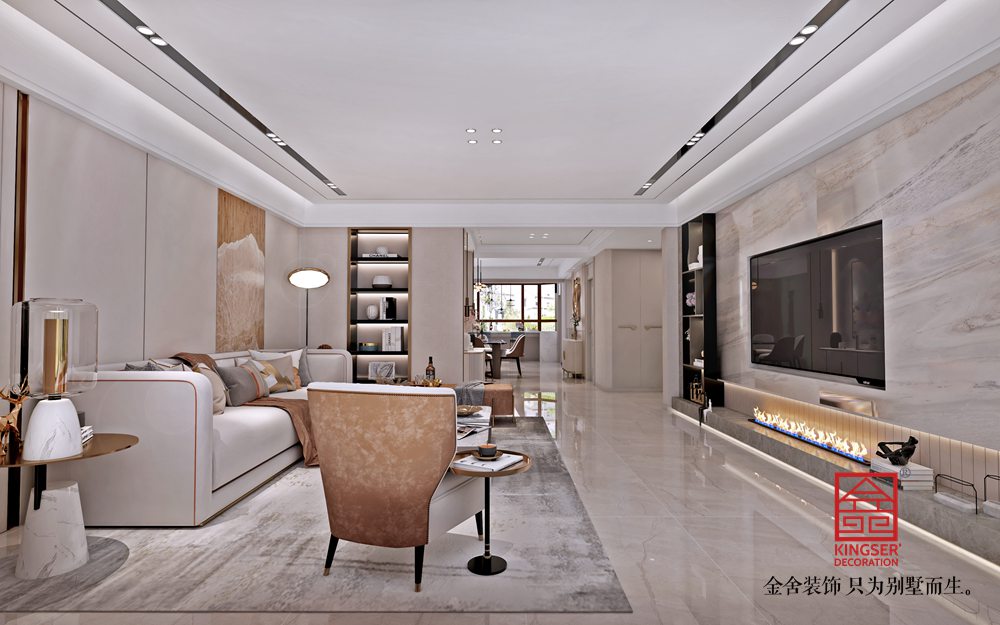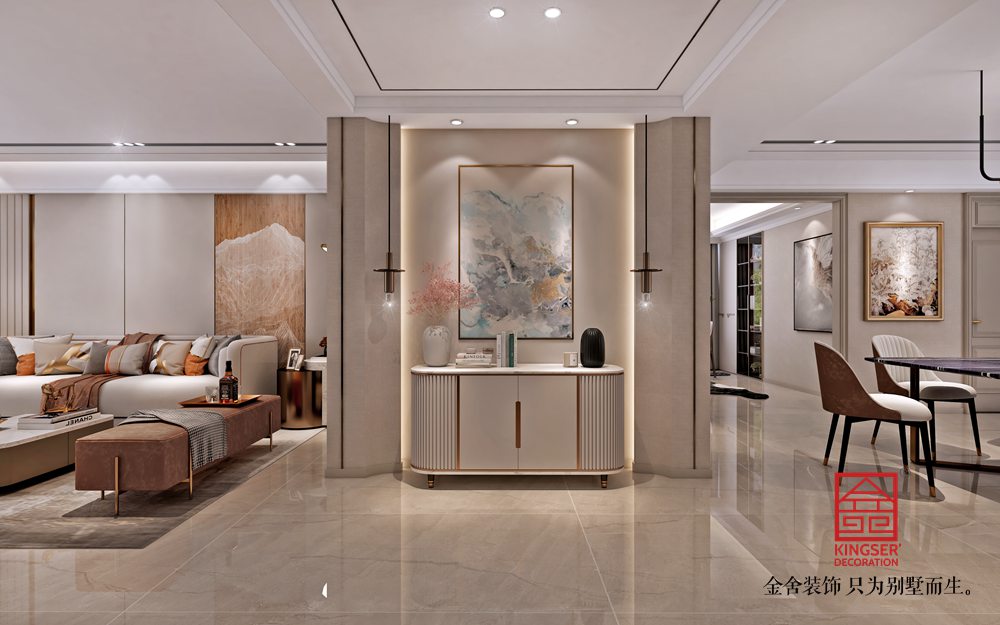 設計師:靳銘銘 設計說明: 此案例為石家莊金舍裝飾-榮盛華府213平米輕奢風格裝修效果圖。輕奢是一種格調風尚,是一種極減的風格不是鋪排和堆積,是用極少的物質和人力,做出高,大,上的規格,給人們的視覺上帶來清新,簡潔,高雅,極貴的感受。輕奢是設計的一種路線和風格,以簡勝繁,以少勝多,達到出奇制勝的效果。