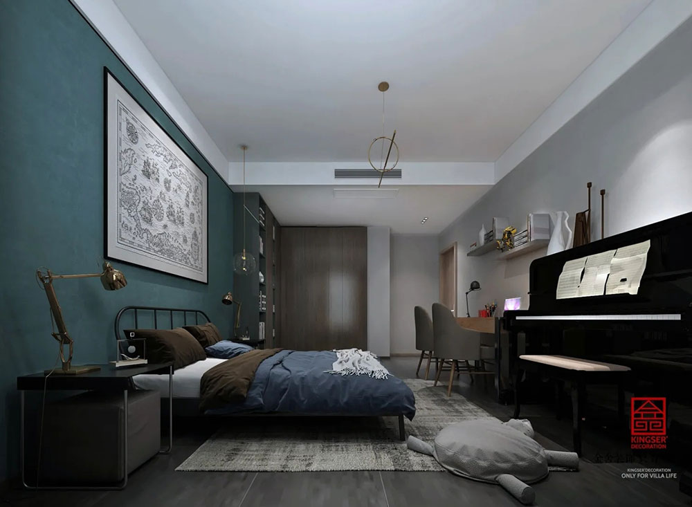 本案是金舍裝飾-榮盛華府178平米現代簡約風格裝修效果圖。做減法的臥室設計。在“斷舍離”思想繁盛的今天,減法設計用最簡潔設計表達最核心實用性。