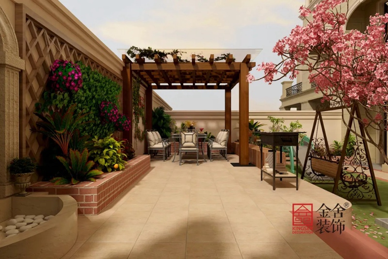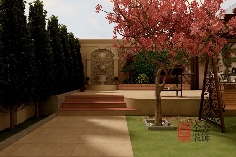 院子的設計采用的基本都運用了歐式元素,墻面雕塑、木質的涼亭架子,法式風格的秋千,每一處小景節點都好像是置身在浪漫的國度,感受隨風飄來的羅曼蒂克。又仿佛看到了《羅馬假日》中“真理之口的浪漫片段”,讓人回味無法忘卻的難忘回憶。