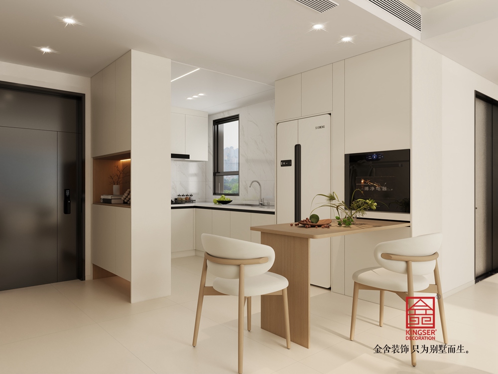 本客廳設計聚焦現代輕奢與實用功能的融合。以簡潔的白色為主調,搭配木質元素,營造出溫馨且雅致的氛圍。墻面設置投影幕布,結合下方的仿真火焰裝置,打造出兼具觀影與氛圍感營造的核心區域,滿足休閑娛樂需求。家具選擇上,弧形白色坐凳與造型獨特的茶幾,為空間注入柔和與精致感。整體布局通透,大窗戶引入充足自然光線,讓空間更顯開闊舒適,是一個集美觀與實用為一體的高品質起居空間。
