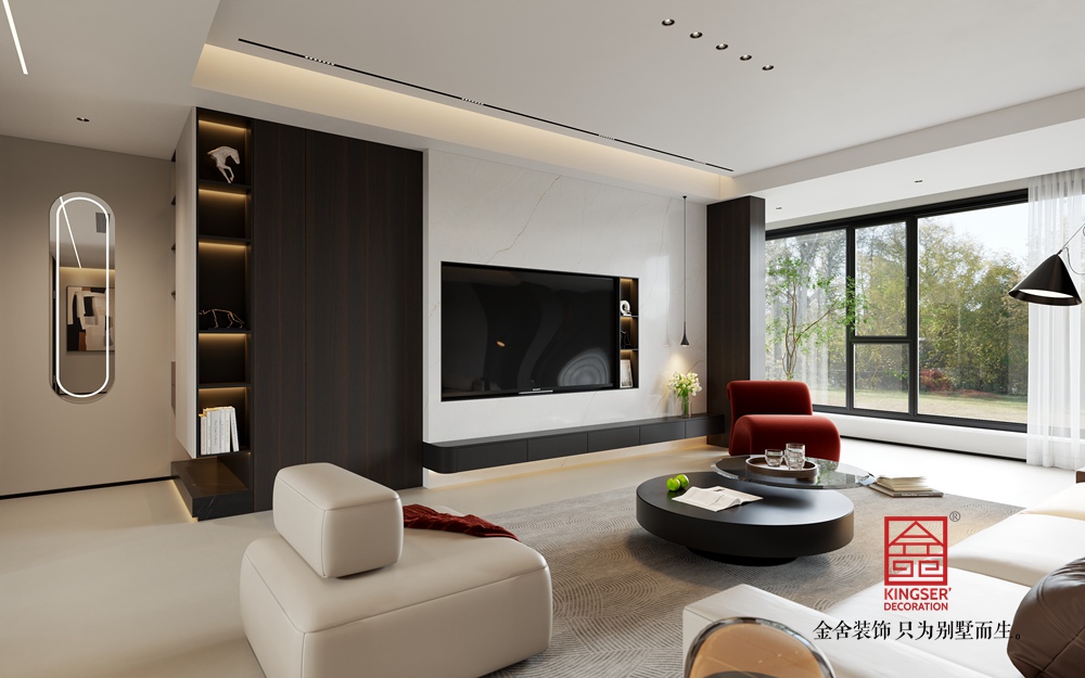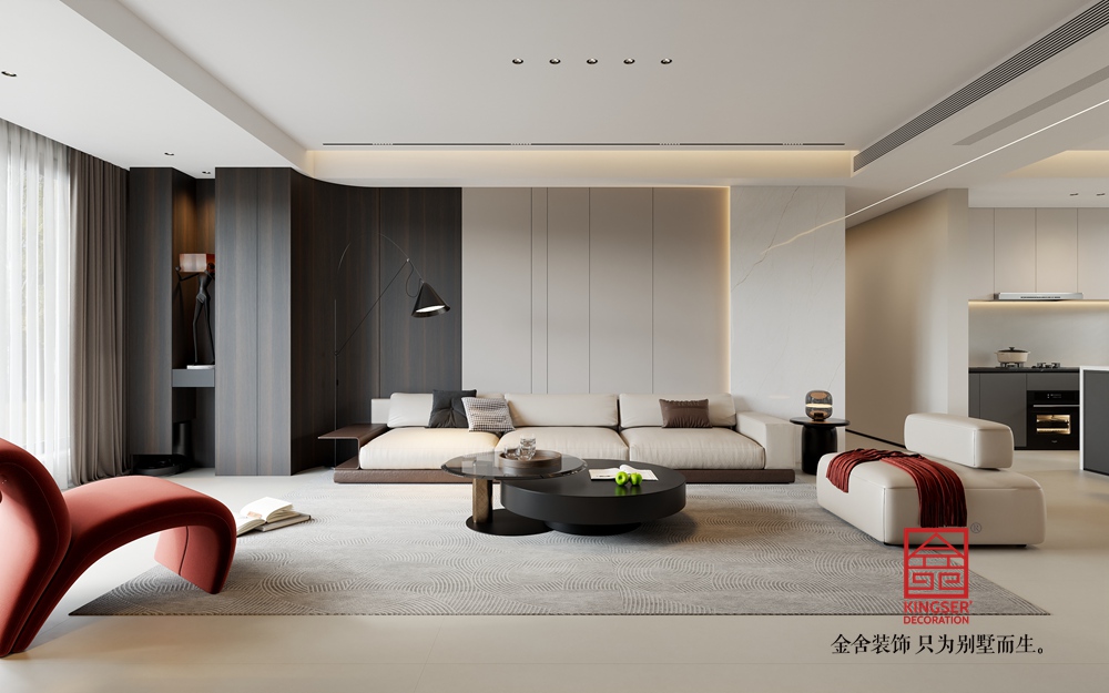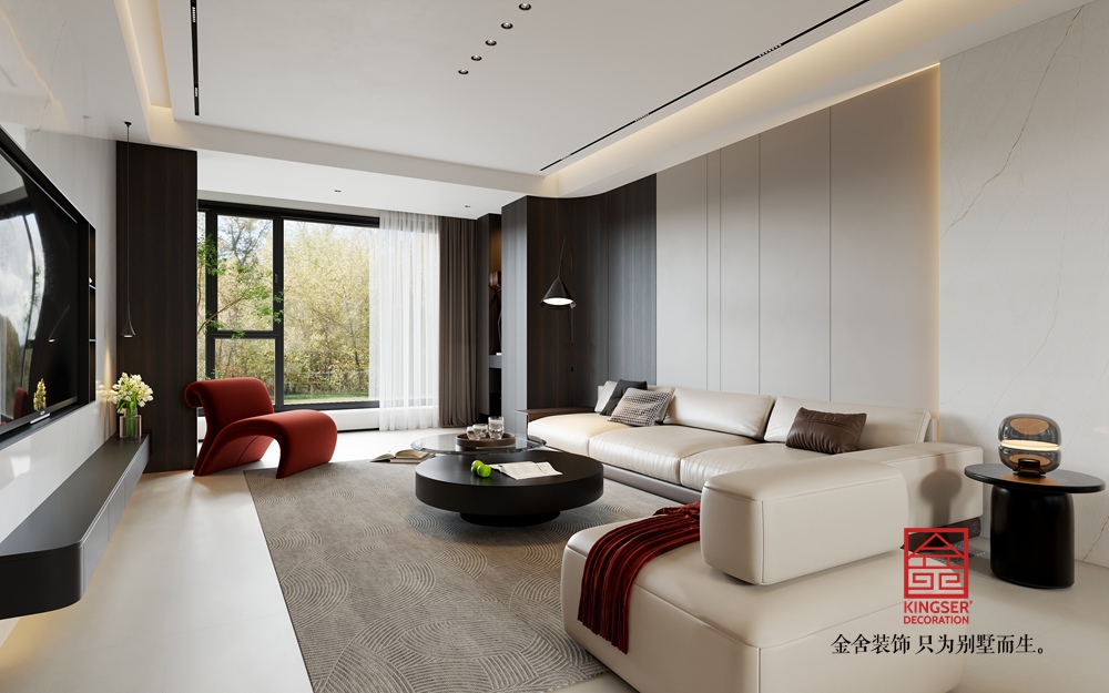 淺米色的大沙發(fā),搭配色彩層次豐富的抱枕,為休憩提供舒適且具美感的載體。黑色圓形組合茶幾,造型簡約又不失設(shè)計感,與整體空間的利落線條相呼應。一旁的白色單人沙發(fā),搭著紅色織物,既豐富了色彩層次,又增添了溫馨感,紅色異形休閑椅更是以亮眼色彩和獨特造型,成為空間的點睛之筆,注入藝術(shù)活力。
