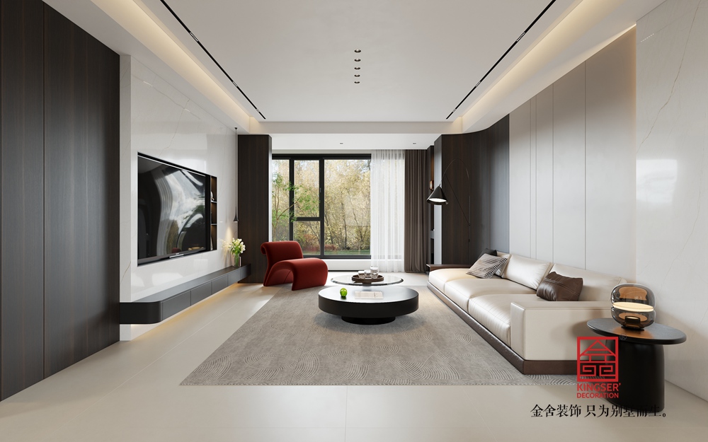 頂部的無主燈設(shè)計,借助線性光與點狀光源,營造出柔和且富有層次的照明效果,讓空間更顯靜謐雅致。地面的紋理地毯,在劃分區(qū)域的同時,也為空間帶來細膩的觸感與視覺變化。整體設(shè)計通過色彩、材質(zhì)的巧妙搭配與光影的精心營造,打造出一個兼具簡約、舒適與輕奢質(zhì)感的現(xiàn)代客廳,滿足人們對高品質(zhì)家居生活的需求。