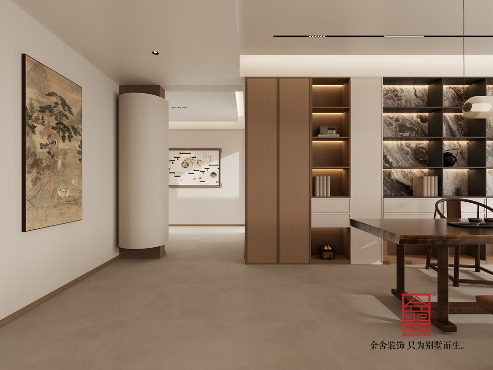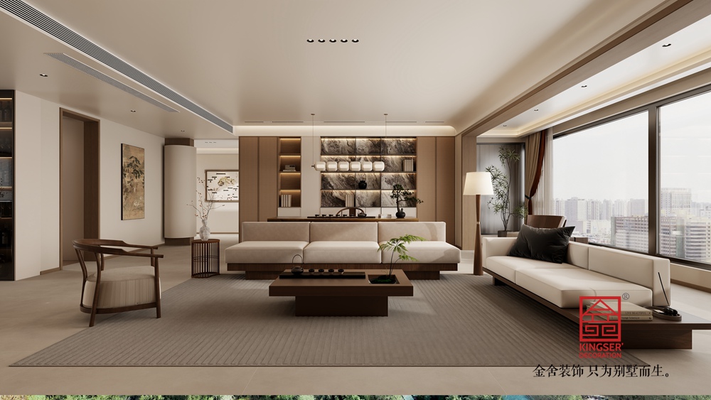 寬闊的落地窗引入充足自然光線,搭配雅致的窗簾,讓室內外景致交融。空間中點綴的綠植、中式擺件,以及墻上的簡約裝飾,都為空間增添了文化氣息與自然意趣,打造出一個兼具實用性與美學價值,能讓人在現代生活中感受東方美學底蘊的愜意居所。