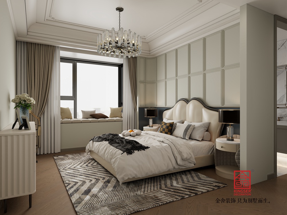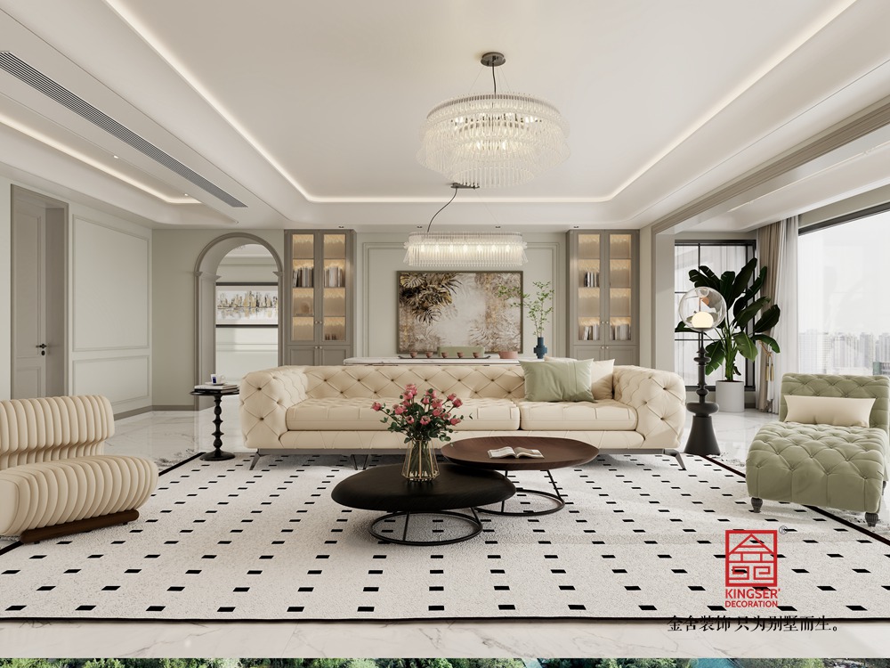 地面黑白幾何圖案地毯,為空間增添時尚與秩序感,成為視覺亮點。整體布局合理,各區(qū)域過渡自然,在滿足功能需求的同時,盡顯高雅輕奢的設(shè)計美學(xué)。
