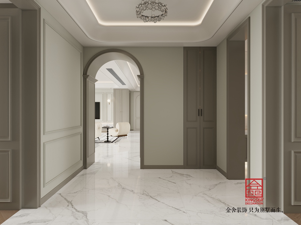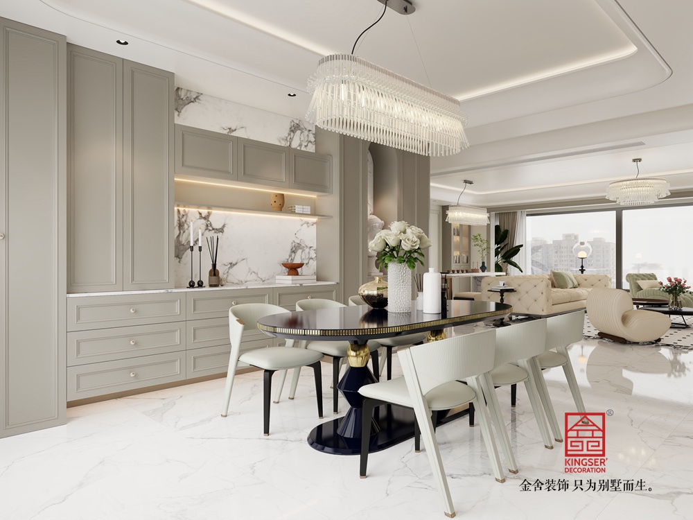 水晶吊燈與長條吊燈交相輝映,散發(fā)著精致光澤,提升空間格調(diào)。家具選擇上,米色皮質(zhì)沙發(fā)質(zhì)感上乘,搭配造型簡約的茶幾,營造出舒適且具品味的休憩區(qū)域。