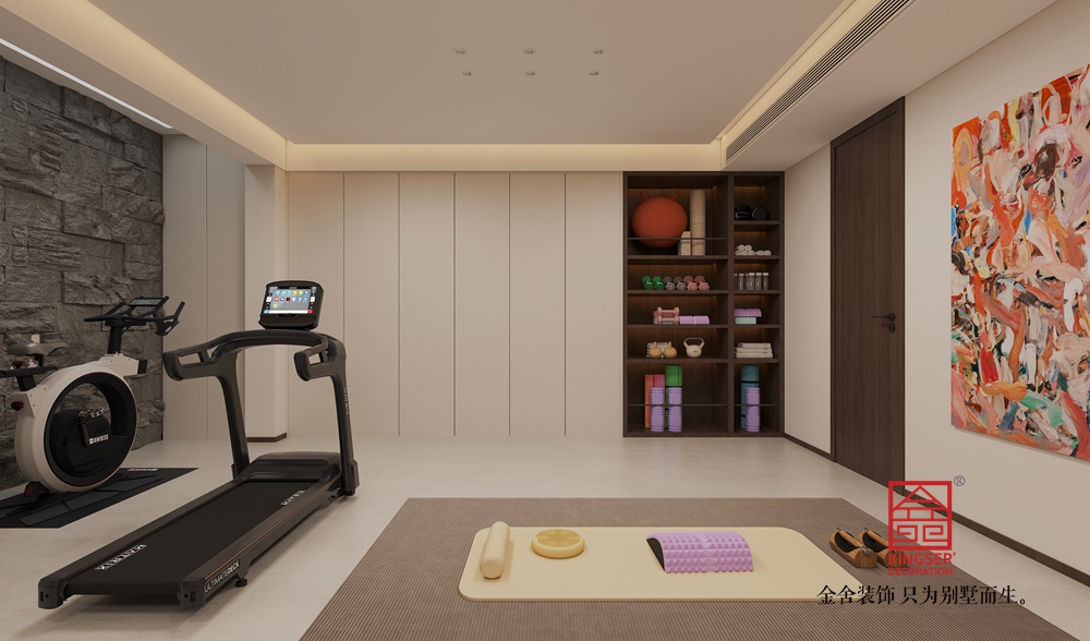 采用開放式布局,將觀影、休憩功能有機整合。線性燈光設計強化了空間縱深感,隱藏式燈帶與點光源結合,營造出柔和且富有層次的照明效果;大面積落地窗搭配百葉簾,保證采光的同時兼顧隱私,讓空間在通透與雅致間找到平衡。